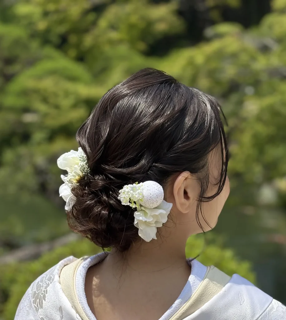 洋装では自然体の華やかさを、和装では凛とした気品を。どちらのスタイルでも、その人らしさと背景の美しさを大切に仕上げます。